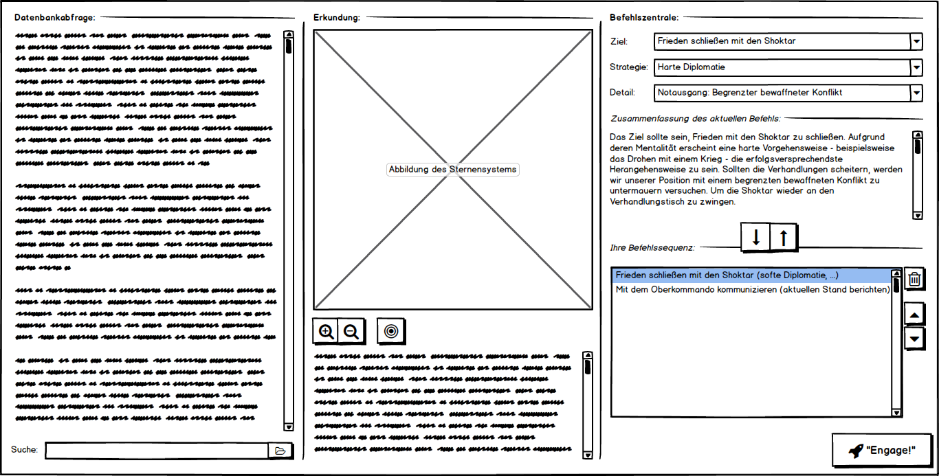 Sind Sie mit Ihrer Befehlssequenz zufrieden, lösen Sie die eigentliche Interaktion per Klick auf den (in der Skizze so benannten) „Engage!“-Button aus – und die Story nimmt ihren weiteren Lauf.